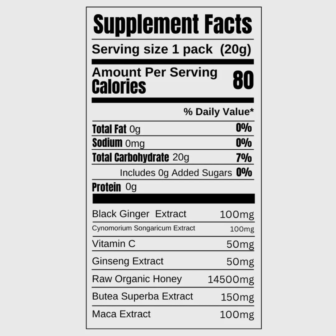 This honey is potent—start with half a pack to see how it works for you. In about 30 minutes, you’ll feel the difference. Adjust as needed to find your perfect dose, and get ready for some serious performance.